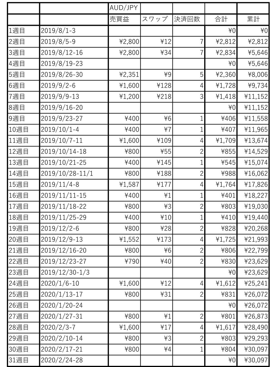 | AUD/JPY | 売り | 85.80~109.80円 | 1,000通貨 | 0.8 | 31本 | 800円 |