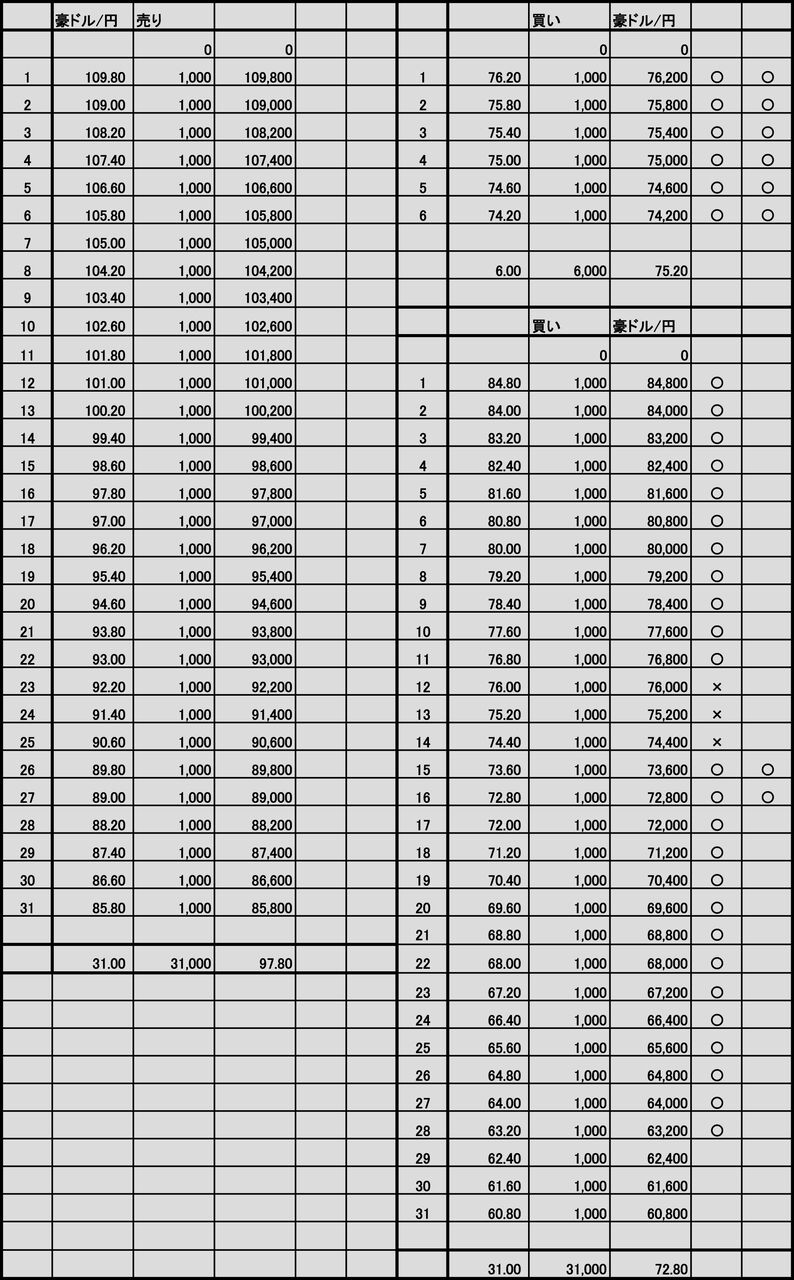 | 買い | 60.80円~84.80円 | 1,000通貨 | 0.8 | 31本 | 800円 |