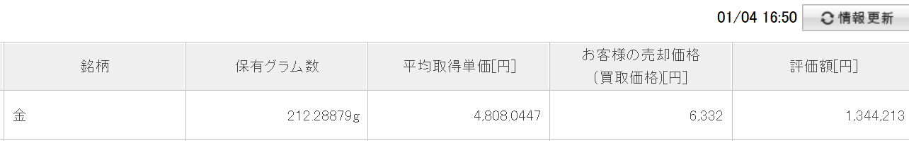 2020年12月末(102か月目)の楽天証券での金運用の評価は1,344,213円となりました。